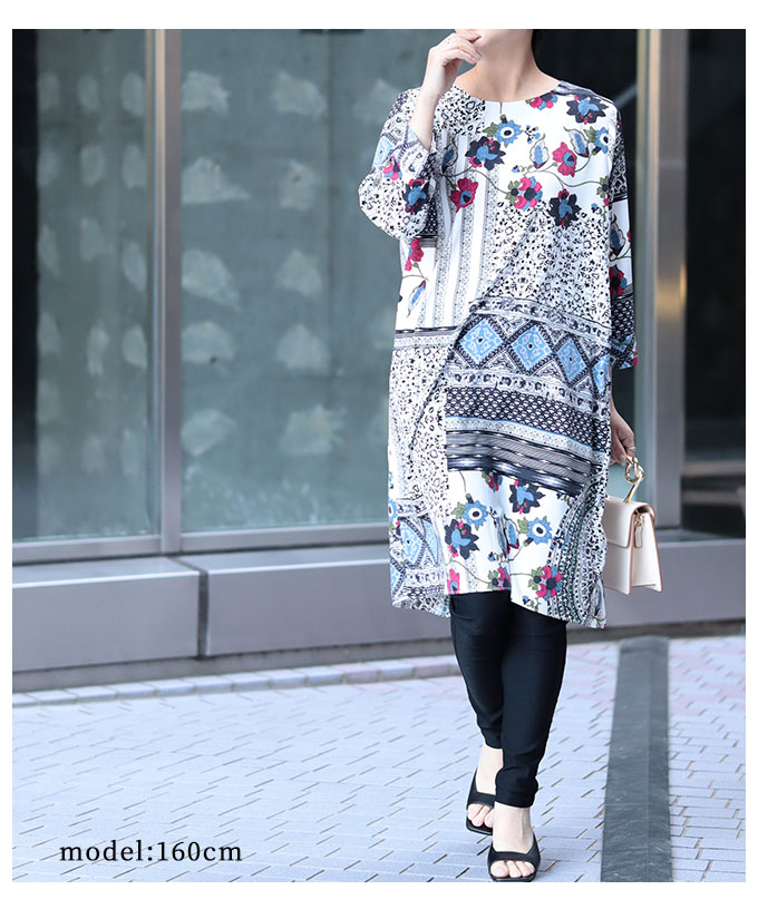 アジアンな花柄アシメプリントチュニック レディース ファッション チュニック 七分袖 ブラック 総柄 アシンメトリー 春 夏 秋 M L Mサイズ Lサイズ 9号 サワアラモード アラモード sawaalamode 可愛い服 otona kawaii かわいい服 かわいい 可愛い